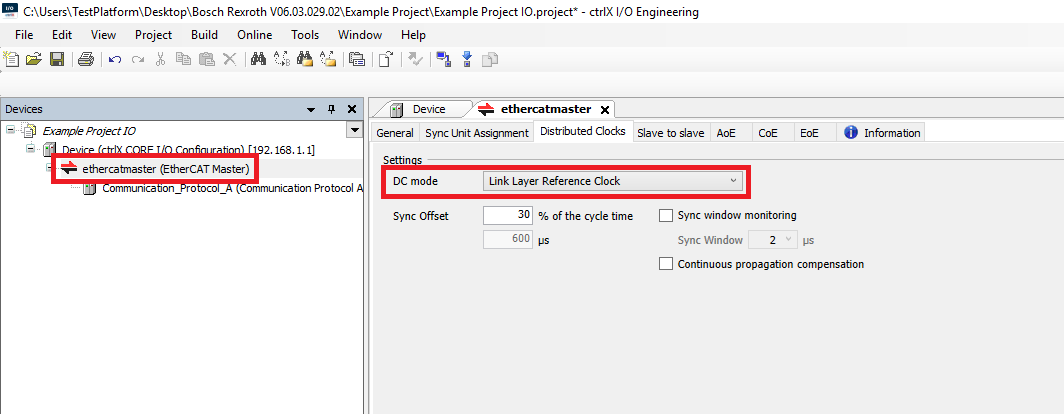 Step 1: In the I/O configuration Devices tree click the EtherCAT Master. In the Distributed Clocks tab set the DC mode setting to Link Layer Reference Clock. Remember to download the changed I/O config to the controller