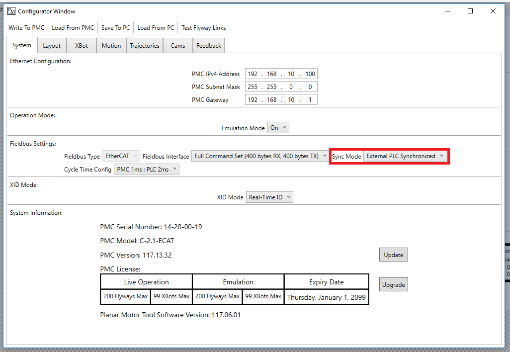 Step 3: In the Configurator Window set the Sync Mode to External PLC Sychronized. Remember to Write To PMC