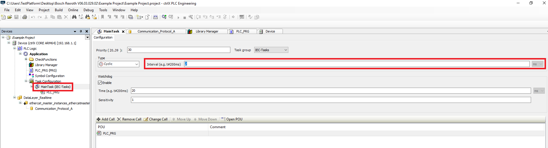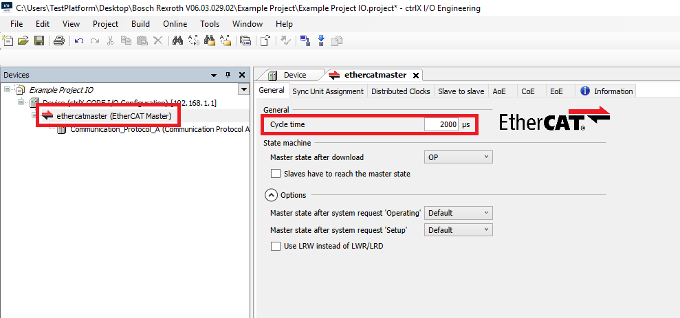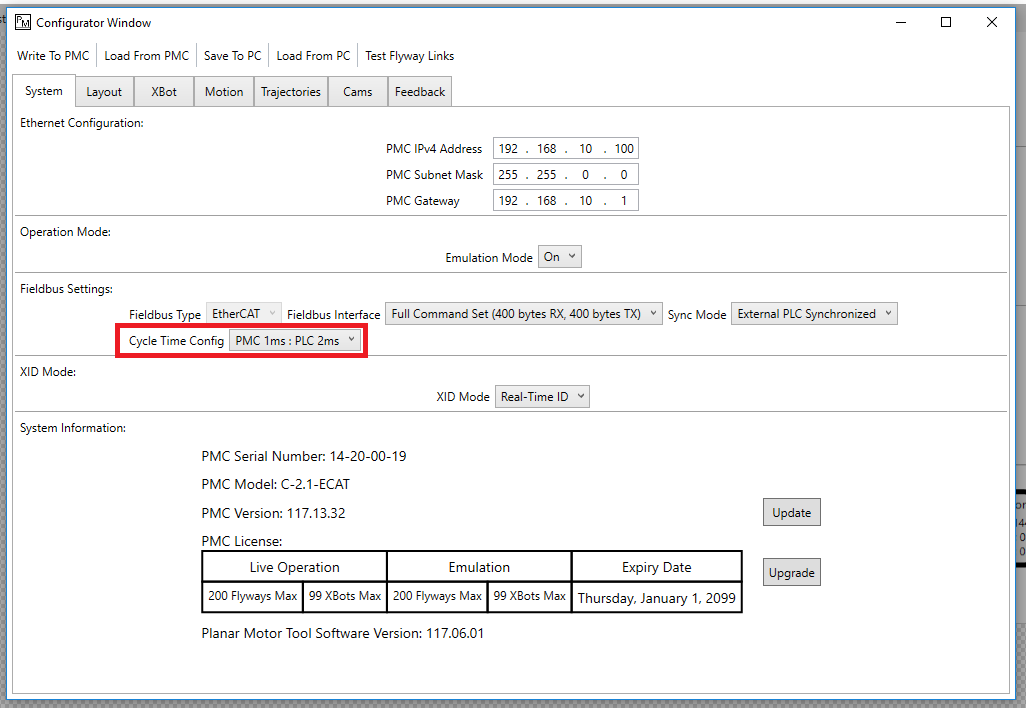 Step 4: Make sure that the PMC Cycle Time Config, the PLC task interval, and the EtherCAT Master cycle time are all the same
