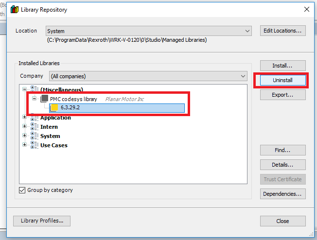 Step 3: In the Library Repository window find the old version of the PMC library and click "Uninstall"