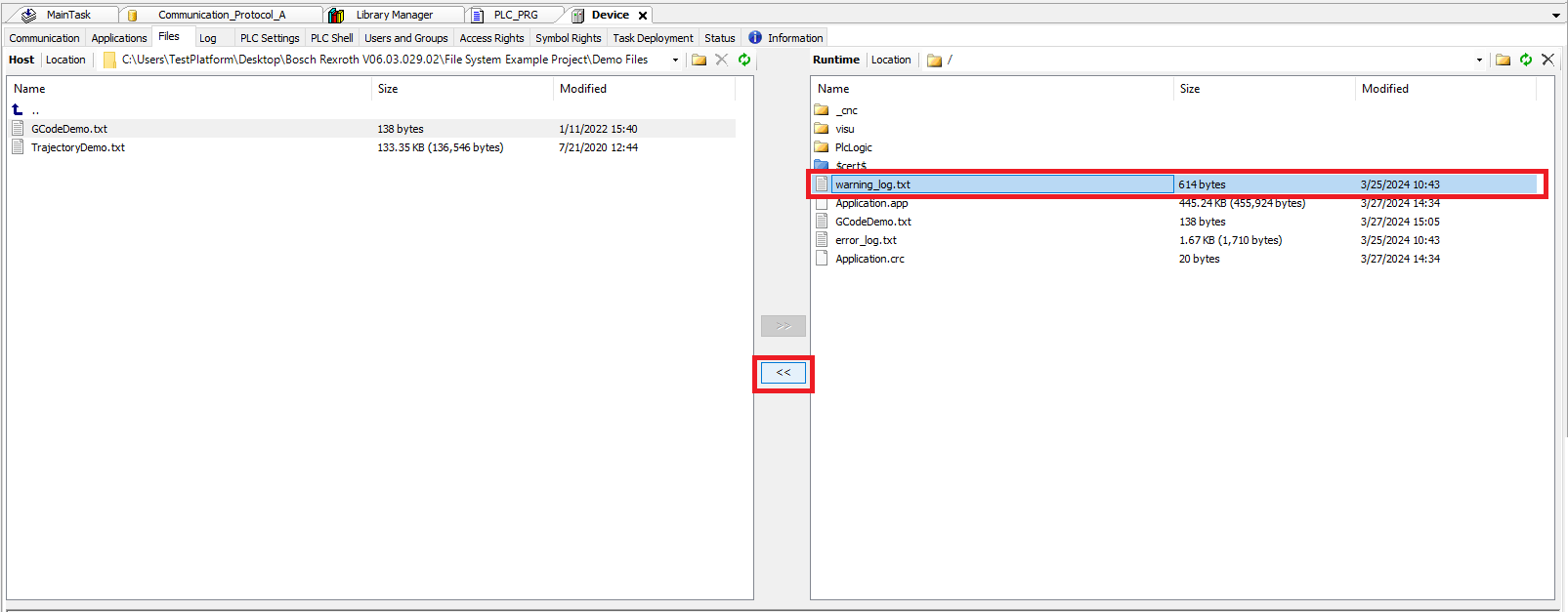Step 3: To download file(s) from the controller select the file(s) on the right (controller) side and then click the << button