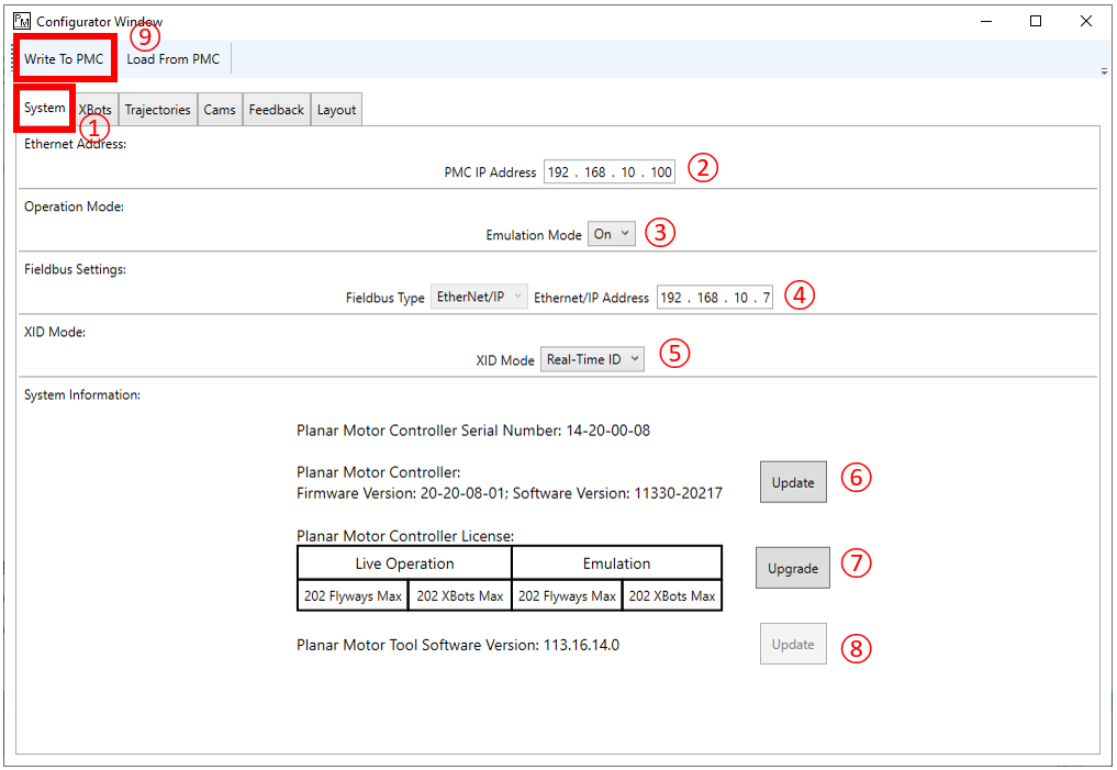 Through the system setting tab, you can change PMC IP Address, toggle emulation mode, change fieldbus setting, switch XID Mode, update PMC, upgrade license, and update Planar Motor Tool.