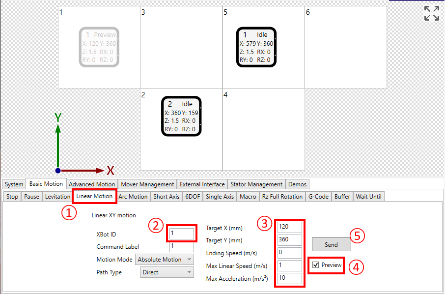 ④ If you would like to preview the target position before sending the command, check “Preview”.