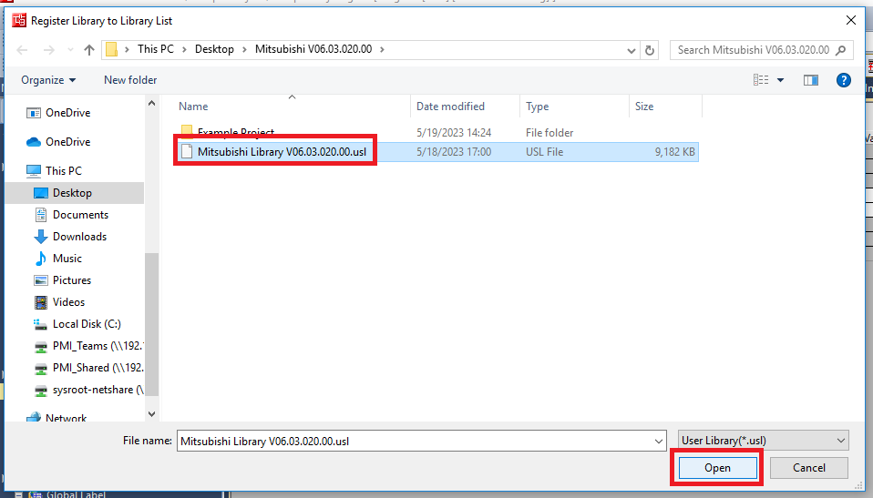 Step 2: Navigate to and select the PMC Mitsubishi Library .usl file. Click Open