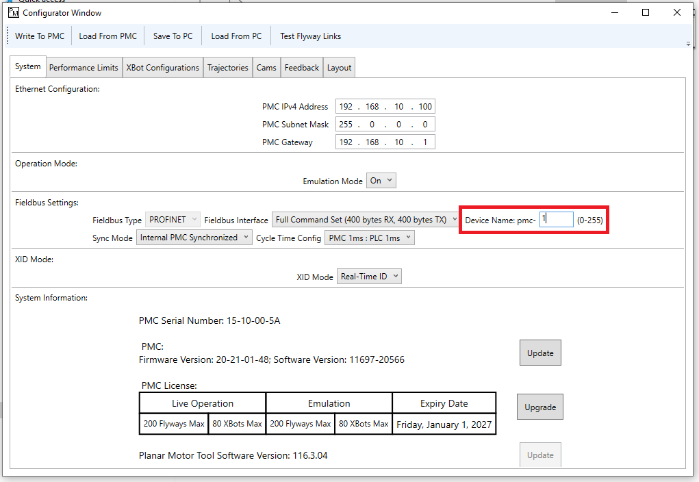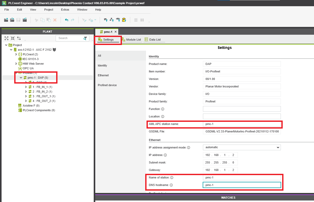Step 6: Double click the PMC DAP and go the Settings tab. Make sure that the AML APC station name, Name of station, and DNS hostname all match the Device Name set in the Planar Motor Tool configurator