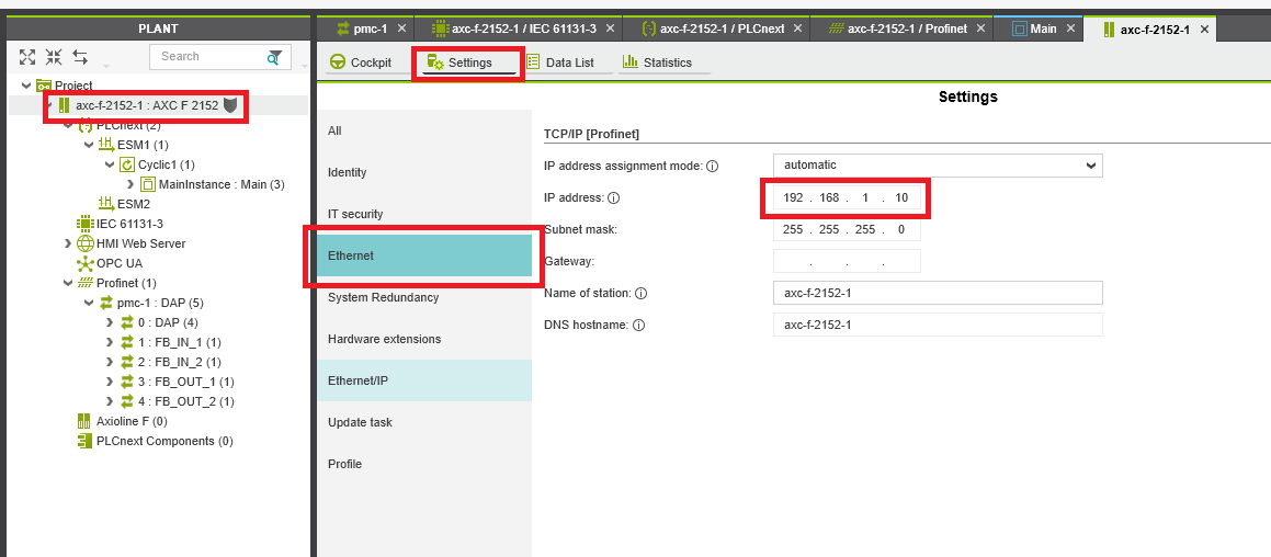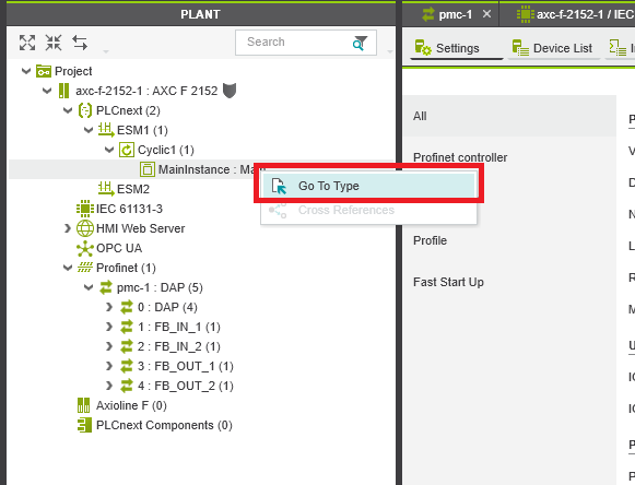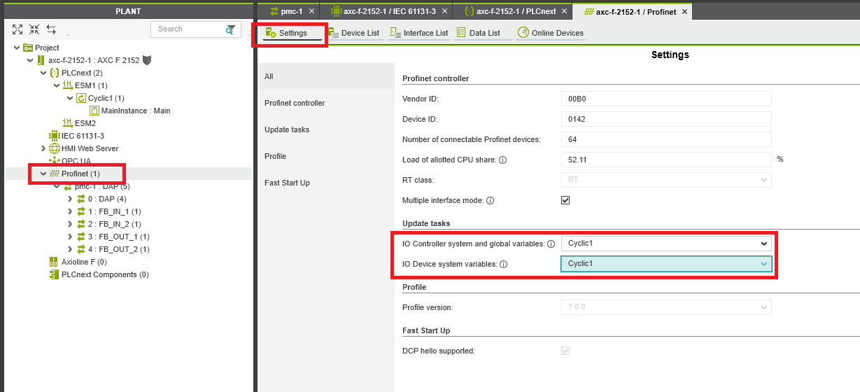 Step 13: Double click the Profinet in the Plant panel. In the Settings tab make sure that both the Update tasks are set to the cycle task we set earlier