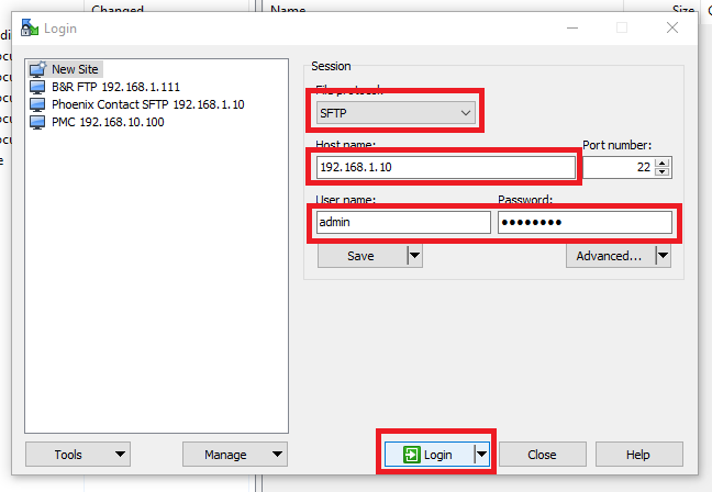Step 4: Select SFTP for the File protocol. The Host name is the controller’s IP address. The user name and password is the same as the one used to connect to the controller in PLCnext Engineer
