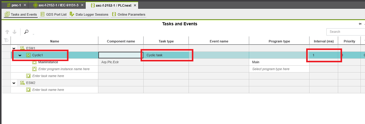 Step 12: Make sure that the main task is Cyclic and change the Interval to the desired communication rate with the PMC. It is also a good idea to change the task’s name to match the new Interval