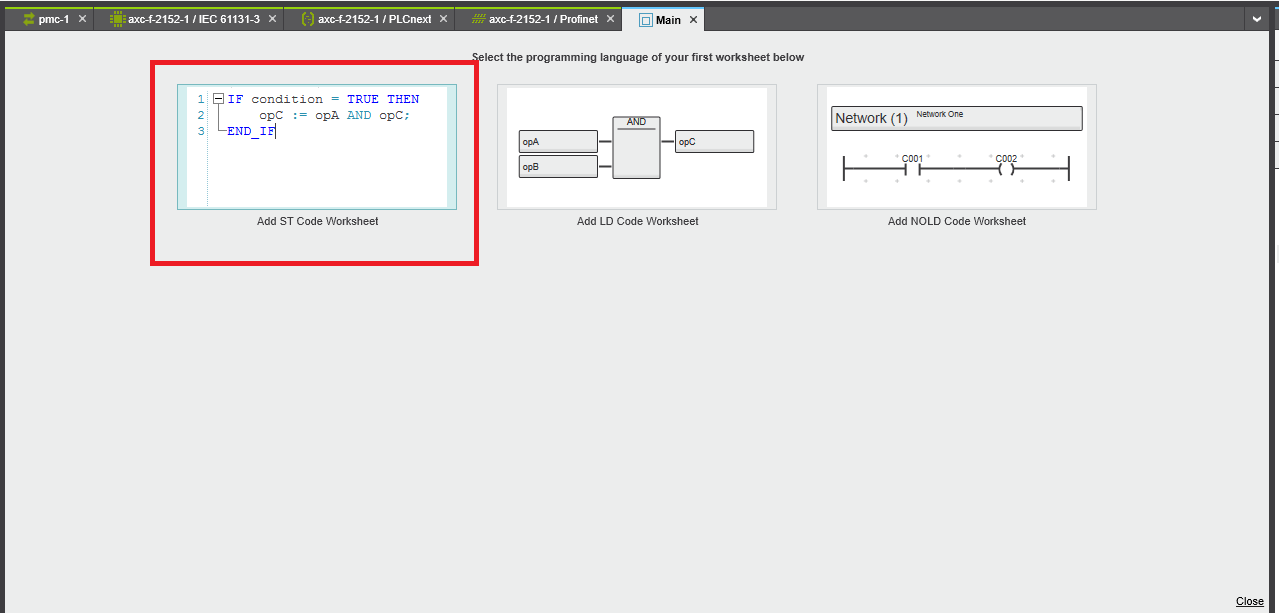 Step 15: The PMC library works with all three programming languages, but for this example we will use ST