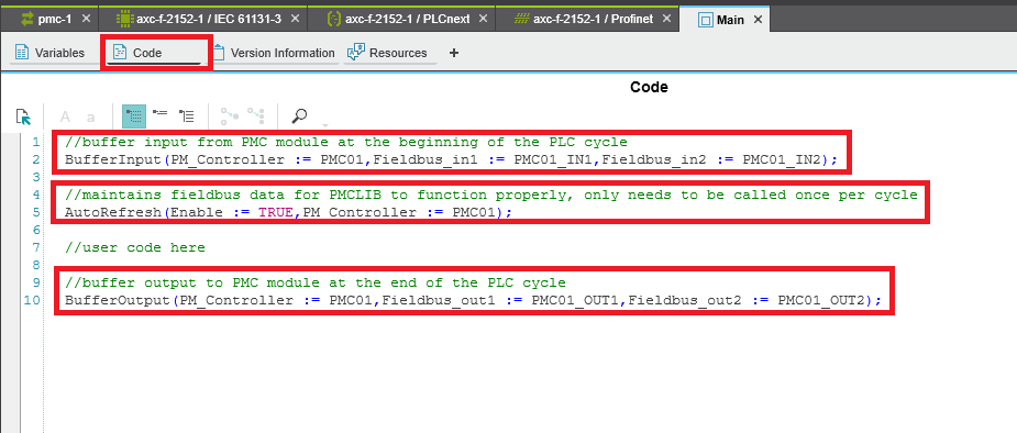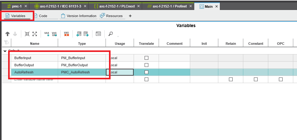 Step 16: In the Variables tab create PM_BufferInput, PM_BufferOutput, and PMC_AutoRefresh function blocks