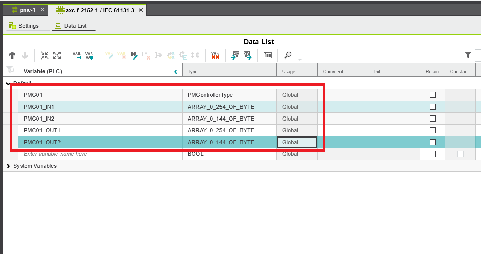 Step 5: Create five different global variables: one PMControllerType variable, two 255 element byte arrays, and two 145 element byte arrays. The PMC input and output each be mapped to one 255 byte array and one 145 byte array. It is recommended to name the arrays so that it is easy to tell which ones are mapped to the input and output