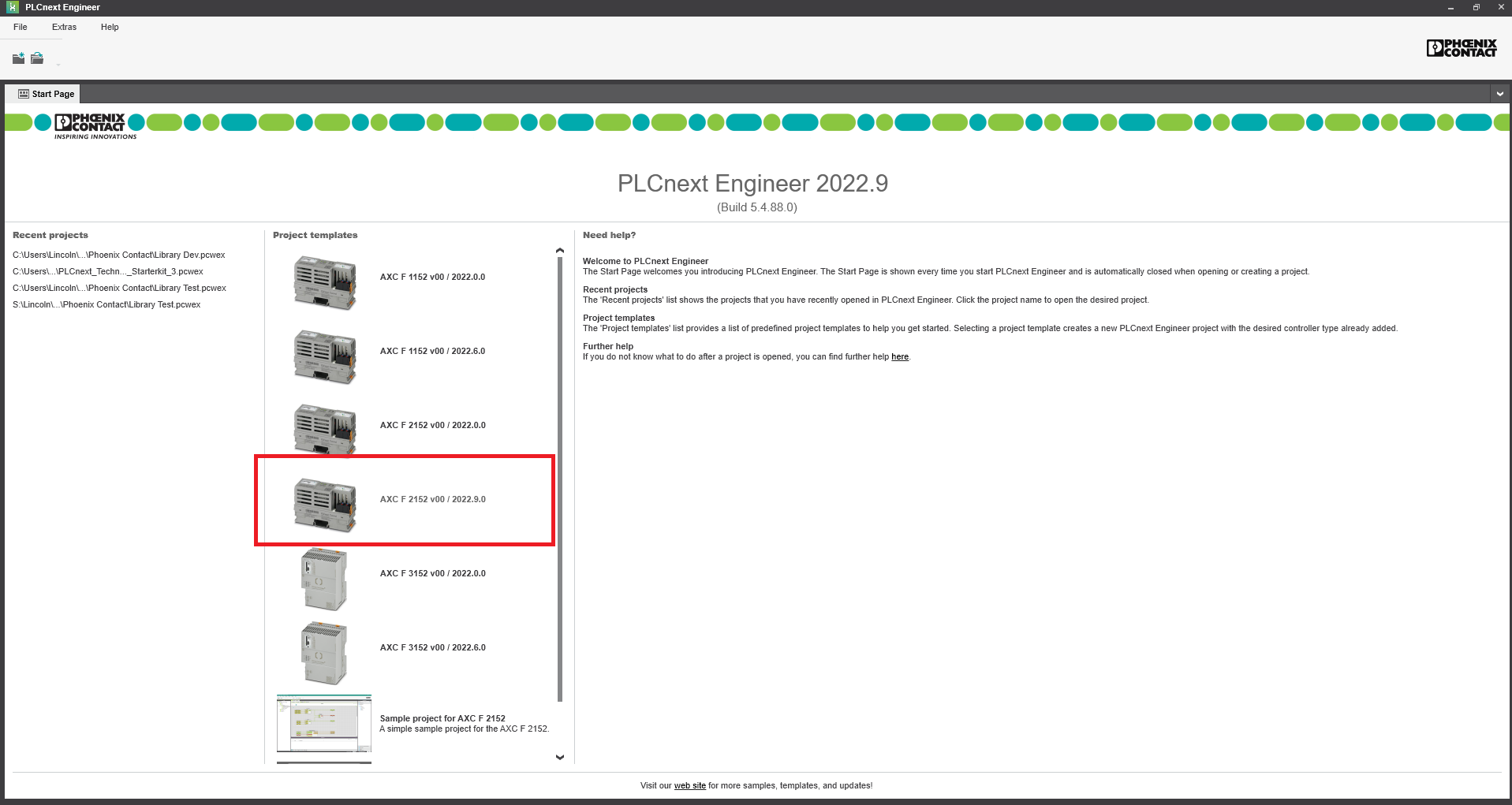 Step 1: At the welcome screen of PLCnext Engineering select the controller being used in the Project templates
