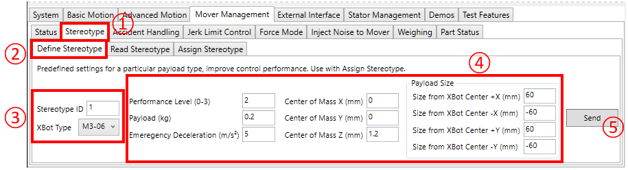 ④ Enter the desired set of parameters related to the payload on the XBot. Performance Level is defined as: 0 = Most stable, 3 = Most responsive