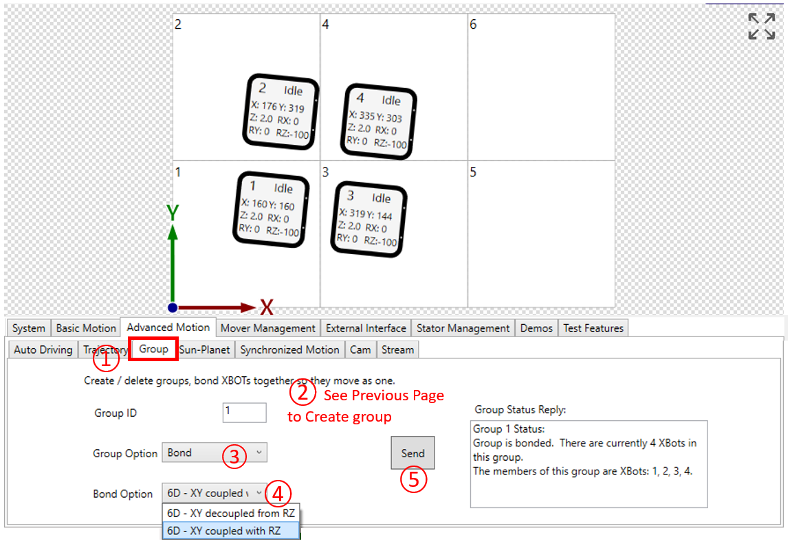 ③ Choose “Bond”, the XBots in the group will move as one. Sending a motion command to any of them will cause all of them to move. The center to center distance between XBots will be maintained