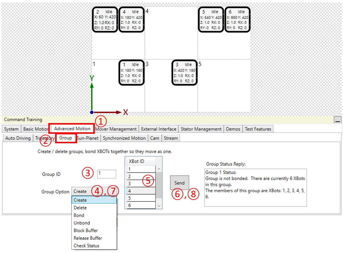 - For a group used in this way, the member XBots can still move relative to each other. It is mainly used to simultaneously block and release the motion buffers of the XBots in the group, so they will start executing their own motion commands simultaneously.