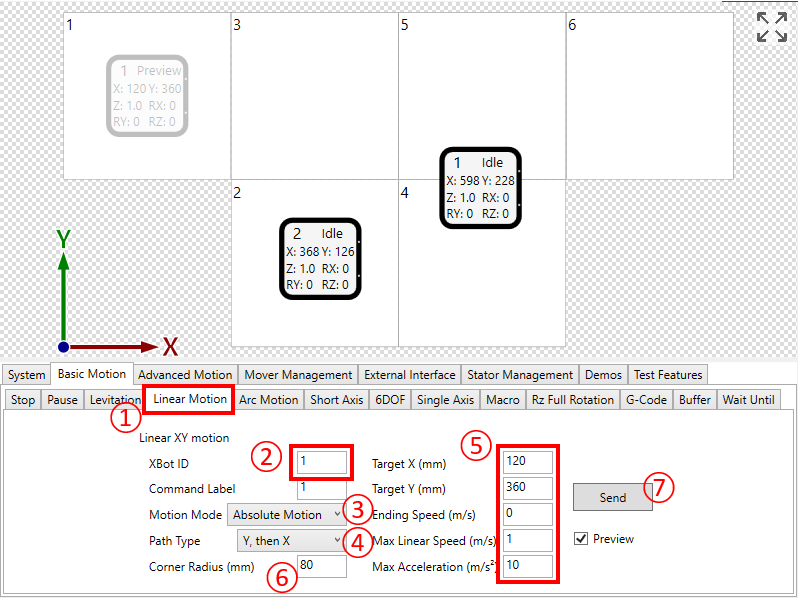 ⑤ Enter the motion parameters including the target position, speed, and acceleration