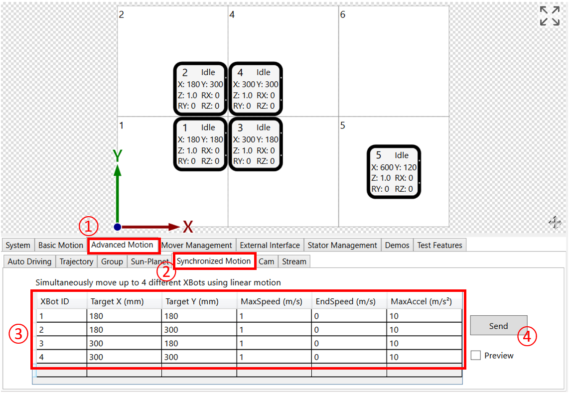 ③ Enter the XBot IDs, target X, Y positions of the XBots you want to move, and speed / acceleration parameters. You can enter up to 4 XBots
