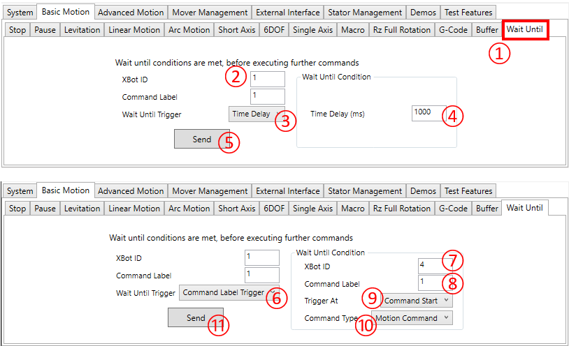 ⑪ Click Send when ready. The XBot will start waiting immediately if its motion buffer is empty, otherwise, this will be added to the XBot’s motion buffer