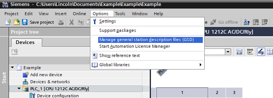 Step 1: Click Options->Manage general station description files (GSD)