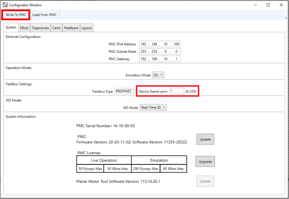 Step 13: The Device Name in the Planar Motor Tool can be found by clicking Configuration->Open Configurator and then accessing the System tab. Make sure that this matches the PMC name in Siemens TIA, then click on "Write To PMC"
