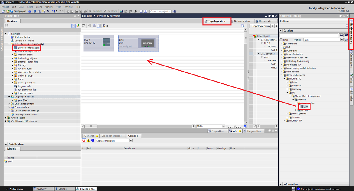 Step 6: Expand the PLC in the Project tree. Click Device configuration. In the Devices & networks window enter the Topology view. In the Hardware catalog go to Other field devices->PROFINET IO->I/O->Planar Motor Incorporated->Profinet->Head module->DAP. Drag and dop the DAP into the Topology view