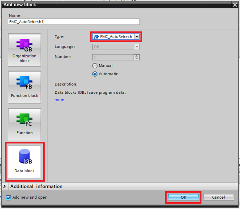 Step 12: In the Add new block window choose Data block. For the type choose PMC_AutoRefresh then click "OK". This should be the one and only instance of the PMC_AutoRefresh function block declared in this project