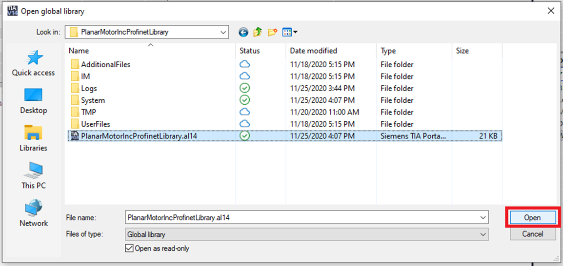 Step 3: Expand PlanarMotorIncProfinetLibrary->Master copies. Then drag and drop the PMC_BaseTypes folder from the Global Libraries over into PLC data types in the Project tree