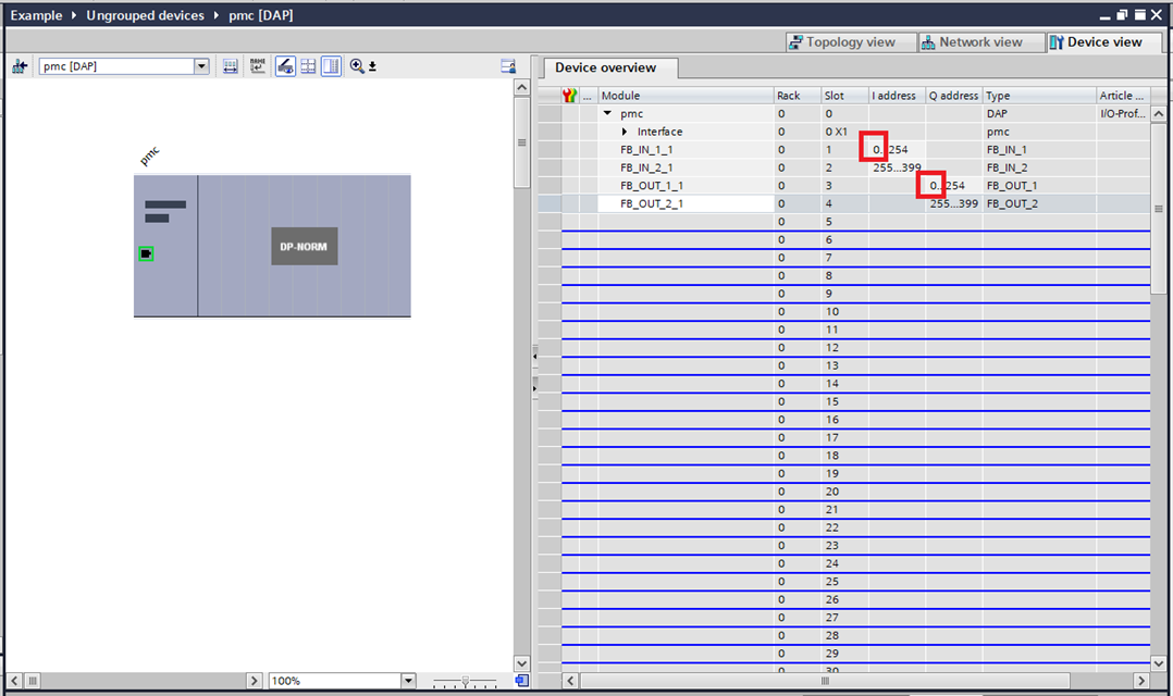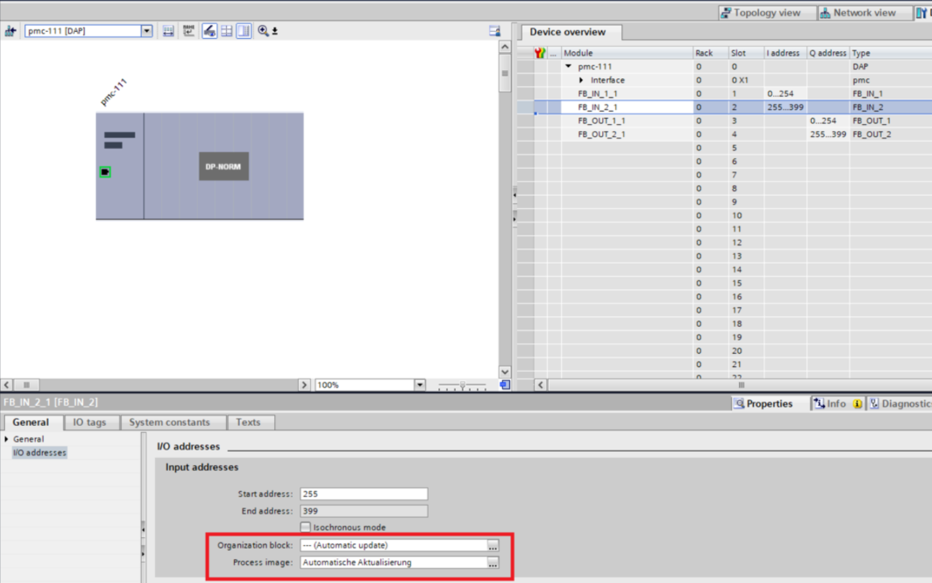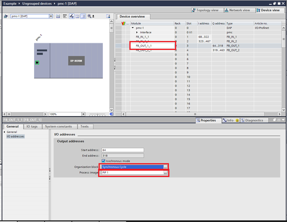 Step 9: Go into the "Device view" and select the PMC. Then select the first of the modules "FB_IN_1_1". In I/O addresses select the "Synchronous Cycle" block created earlier for the "Organization block". Take note of which Process image is being used. This will need to be the same for the entire PMC.