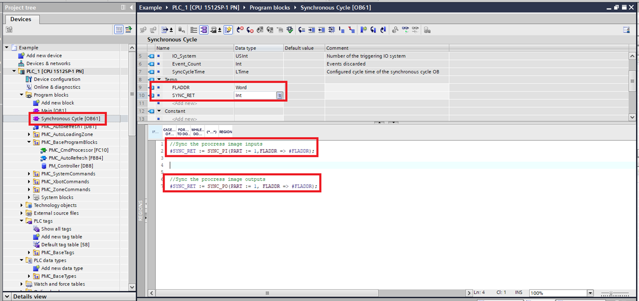Add a SYNC_PI call to the beginning of the block. For the PART input use the number of the Process image selected earlier. For the FLADDR input use the Temp WORD variable. For the output use the Temp Int.