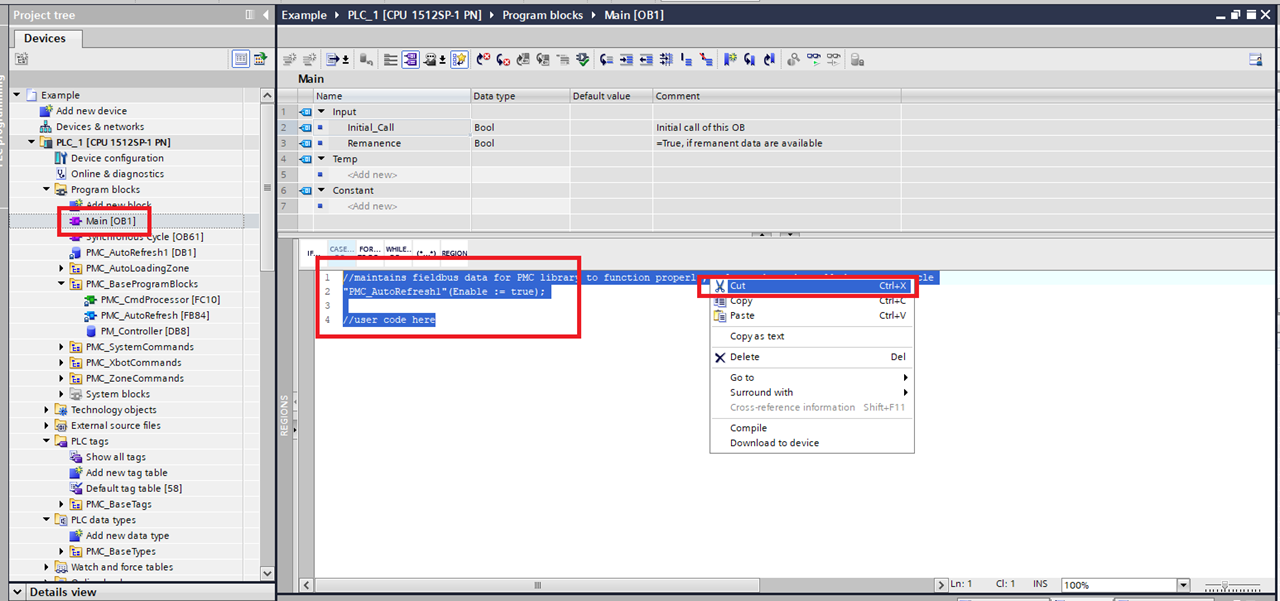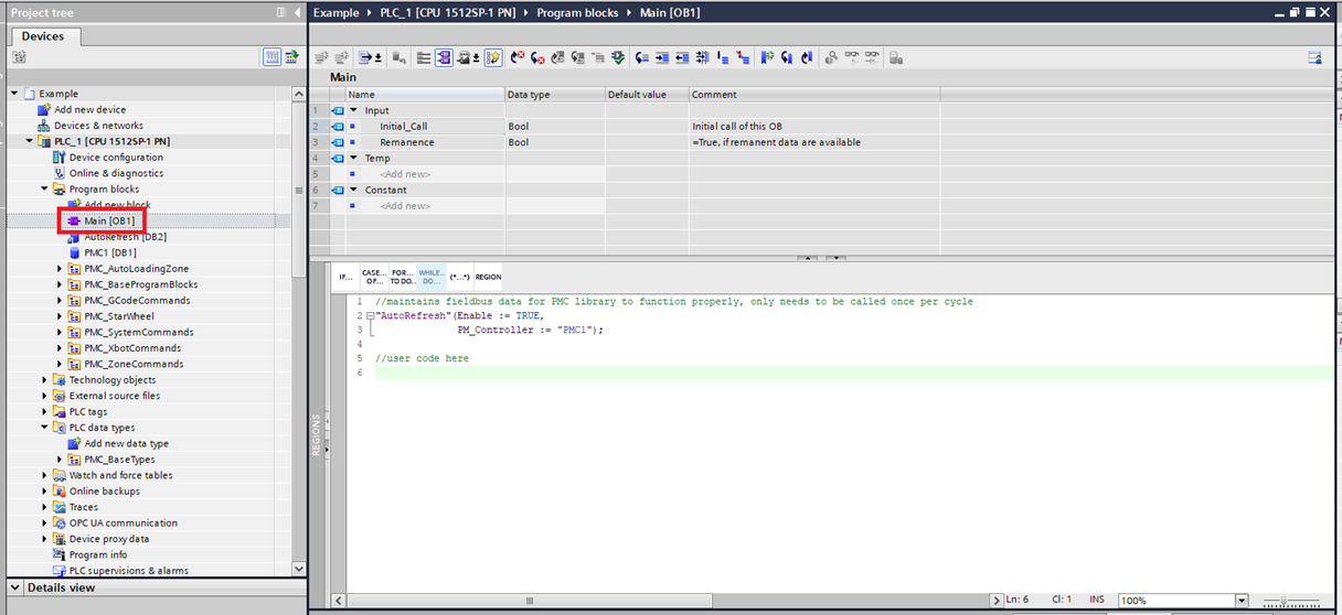 Step 13: In the Main make sure that the instance of the PMC_AutoRefresh function block is called once and only once per PLC cycle