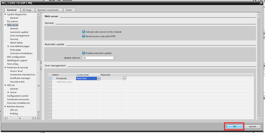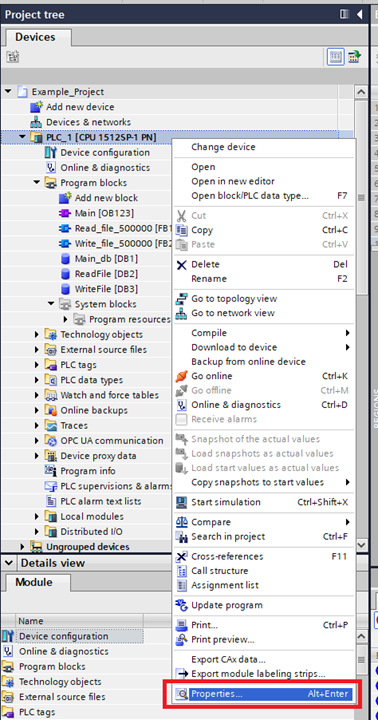 Step 1: To access the memory card online, the web server needs to be activated on the PLC. Go to the Project tree right click the PLC and click Properties…