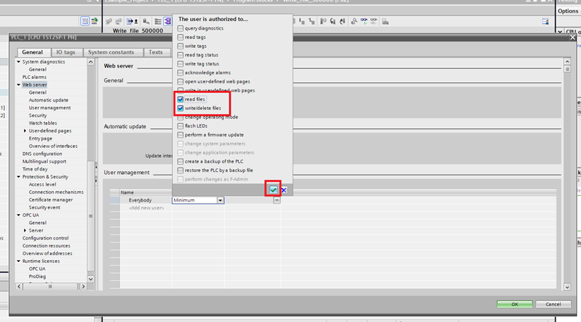 Step 3: Then in User management select the Access level of the user you will use (this example uses Everybody). Then enable “read files” and write/delete files” and click the green check mark button.