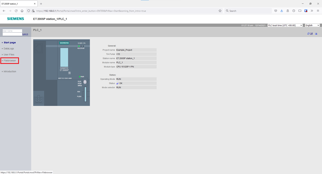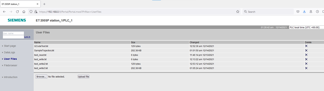 Step 9: Here you can upload, delete, and download the files that the PLC can actually access itself.