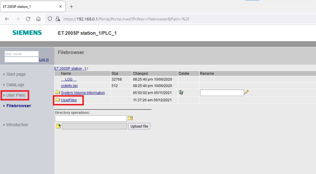 Step 8: Here you can navigate, download, and upload files. However, the PLC can only access files in the “UserFiles” folder. You can only write to/delete from the “UserFiles” folder using the User Files option on the right side.