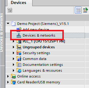 Step 7: In the Devices & networks window switch to the Network view. Connect the PLC to the PMC by clicking the port on the PLC and dragging it over to the port on the PMC