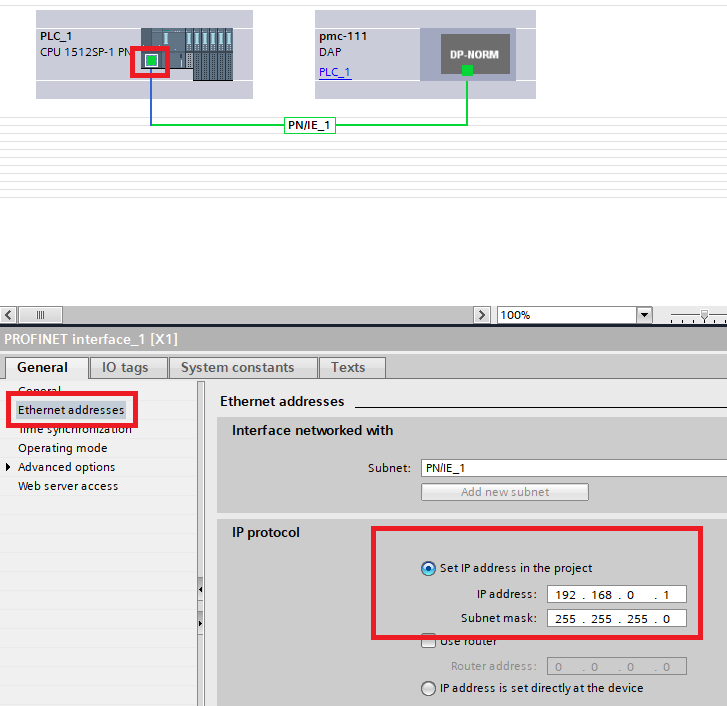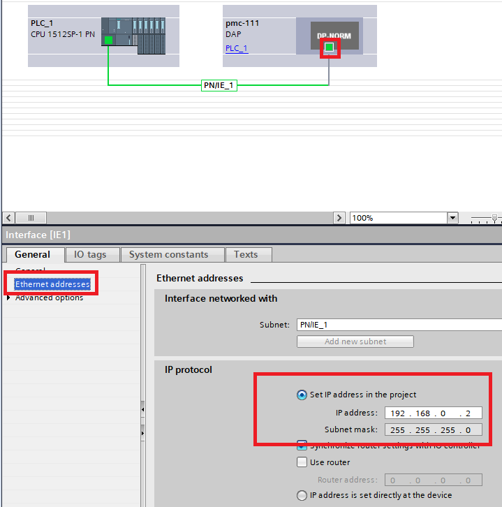 Step 16. Click on the Ethernet Port of the PMC, make sure the IP address of the PMC is on the same subnet as the PLC, but is different from the PLC and other devices on the profinet network.