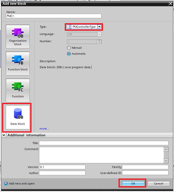 Step 5: Create a new Data block of Type PMControllerType and click OK