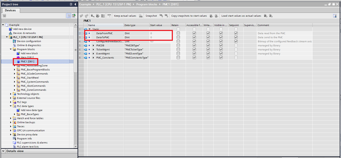 Step 6: Click the PMControllerType data block you just created. Make sure that DataToPMC matches the starting address of the FB_OUT. Make sure that DataFromPMC matches the starting address of the FB_IN. These will match by default, but if you need to change the address of FB_IN or FB_OUT you will need to change these.